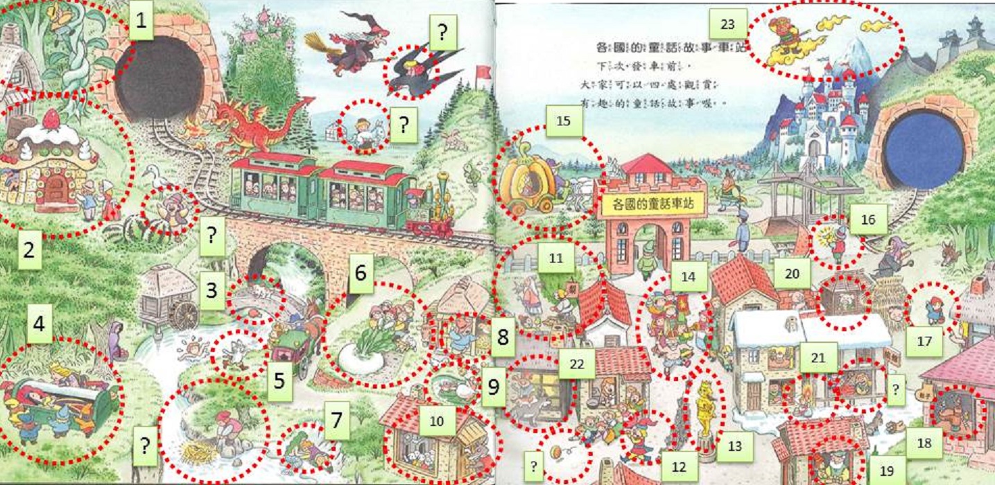 這本最吸引我的是各國童話與日本童話的畫面,隱藏了很多故事角色。有些抓出來會讓人會心一笑,有些我也不知道出處在哪裡?至少涵蓋了安徒生與格林童話,伊索寓言,中國的童話也在裡頭。如果孩子有先備知識,才能有更多的趣味,因為他們能夠一一破解,不知道的有賴大人的引導,讓他們發現有非常多好看的題材可以選擇。